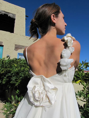 I love that one shoulder has been accentuated with roses made from hemp satin, sheer silk chiffon and organic cotton voile. And even the undergown is made from hemp/peace silk satin.