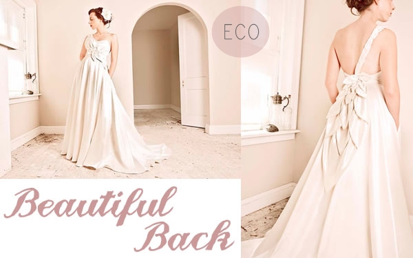 A fun eco wedding dress from Janay A Handmade with a sweetheart neckline, ruffled skirt and modern bow detail at the back. This dress is made from a mixture of eco silk, hemp fabric and organic cotton voile. It costs around £1,000.