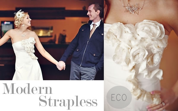 An elegant organic cotton strapless wedding dress with beautiful rose detailing from Pure Magnolia Couture. I love the raw look of the silk roses and the shape of this dress looks very flattering – it also has a full train for all those girls looking for something show stopping. It costs just over £1,000.