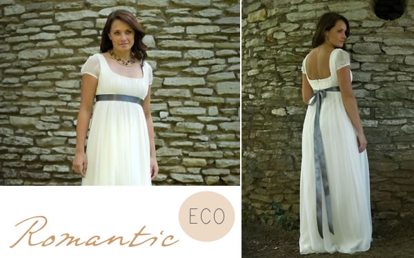 This romantic regency style wedding dress is by Threadhead Creations from organic cotton and unbleached silk chiffon overlay. I particularly love the dark grey sash that ties in a long bow at the back. It costs around £500.