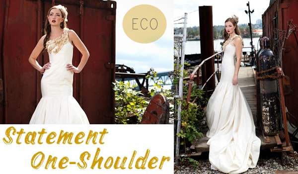 A dramatic eco wedding gown for all those brides who want to make a jaw-dropping entrance. Made from a hemp silk blend it has a long train and golden coloured ruffles across the strap. Made by Pure Magnolia Couture this dress costs just under £800.