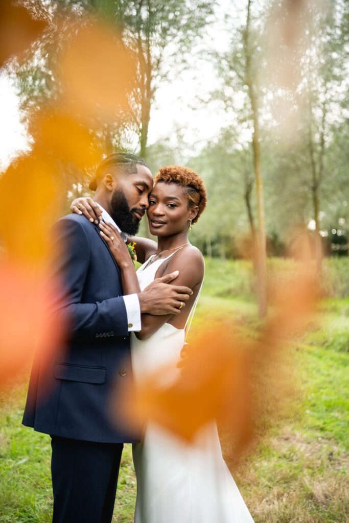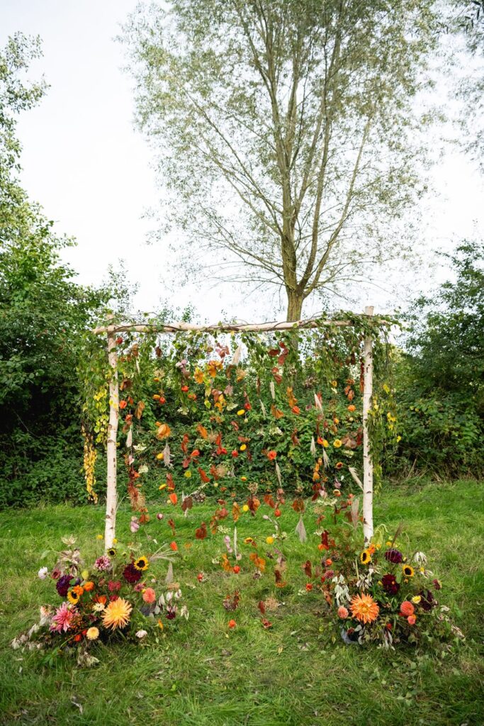 Late Summer Sustainable Wedding Shoot with Autumn Leaf and Seedhead Curtain Ceremony Backdrop