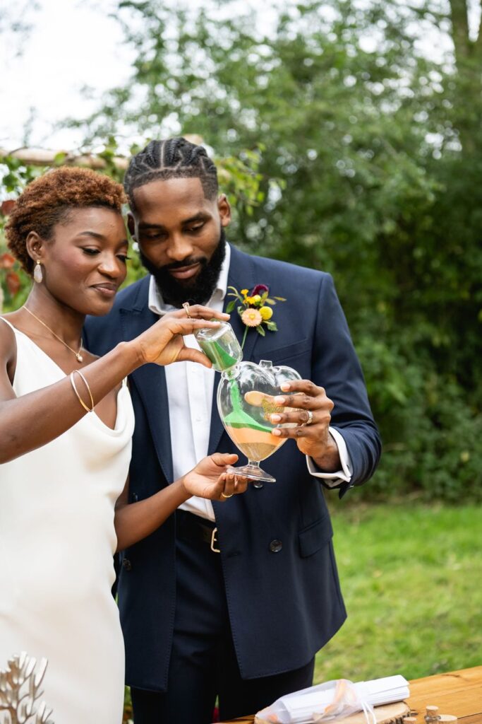 Celebrant Kate want to create a wedding ceremony that she felt reflected the sustainable nature of the shoot, so she put together a handfasting sand ceremony:
