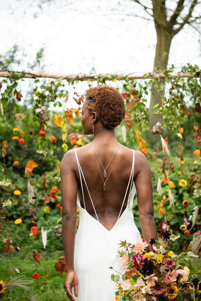 The wedding jewellery featured in this sustainable wedding shoot was provided by KATA Jewellery who make all their jewellery in their Kent workshop. All the precious metals used are 100% recycled and ethically sourced, as well as some Fairmined gold. The diamonds used by KATA Jewellery are sourced from suppliers certified by the Responsible Jewellery Council.